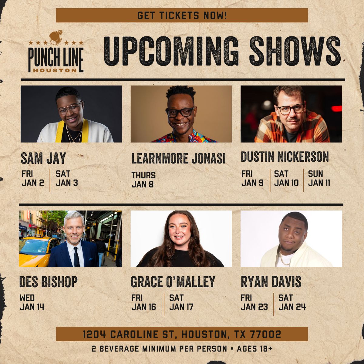 TOM & SAT 1.2-3 - SAM JAY THU 1.8 - LEARNMORE JONASI FRI-SUN 1.9-11 - DUSTIN NICKERSON WED 1.14 - DES BISHOP FRI & SAT 1.16-17 - GRACE O’MALLEY FRI & SAT 1.23-24 - RYAN DAVIS |