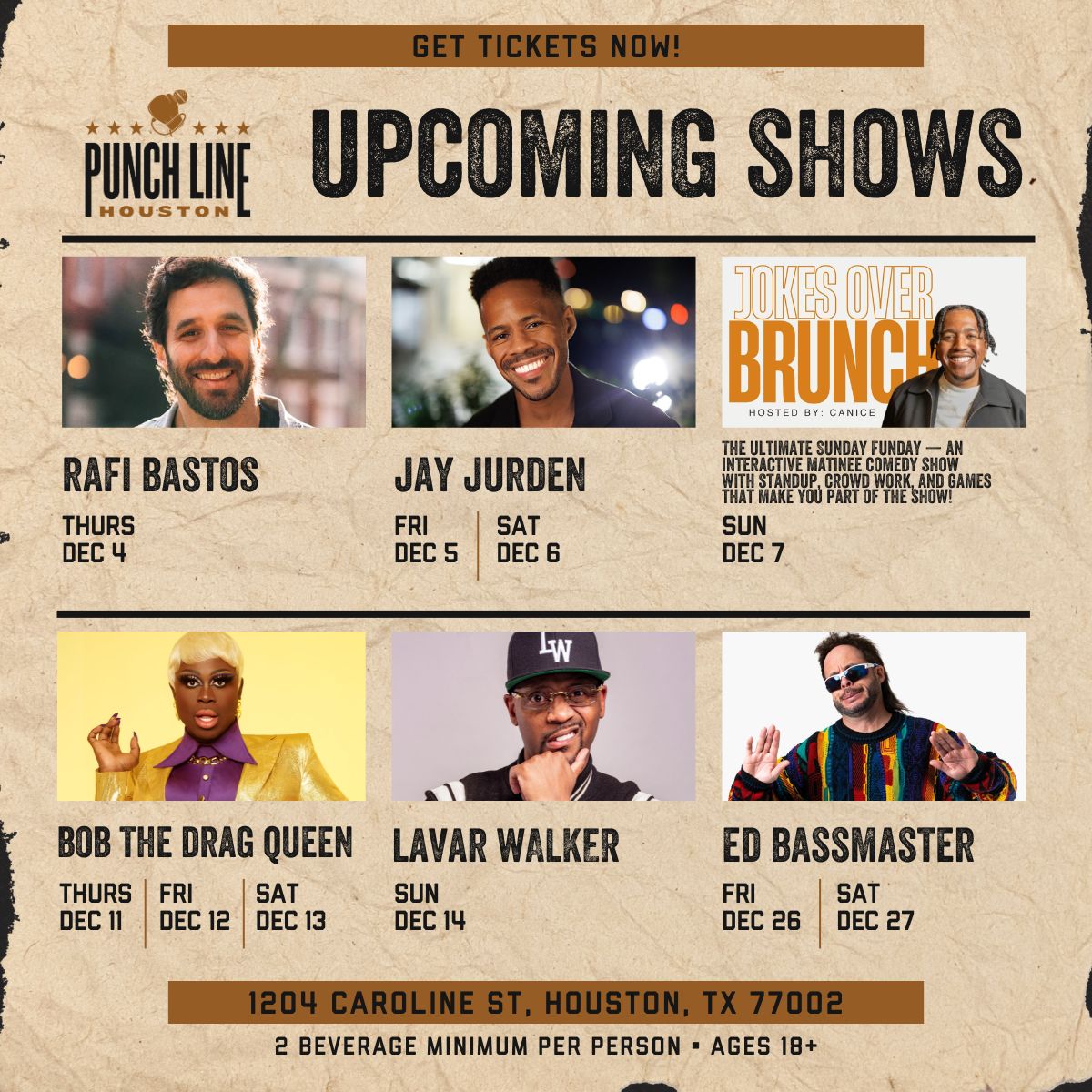 12.4 - RAFI BASTOS 12.5-6 - JAY JURDEN 12.7 - JOKES OVER BRUNCH 12.11-13 - BOB THE DRAG QUEEN 12.14 - LAVAR WALKER 12.26-27 - ED BASSMASTER |