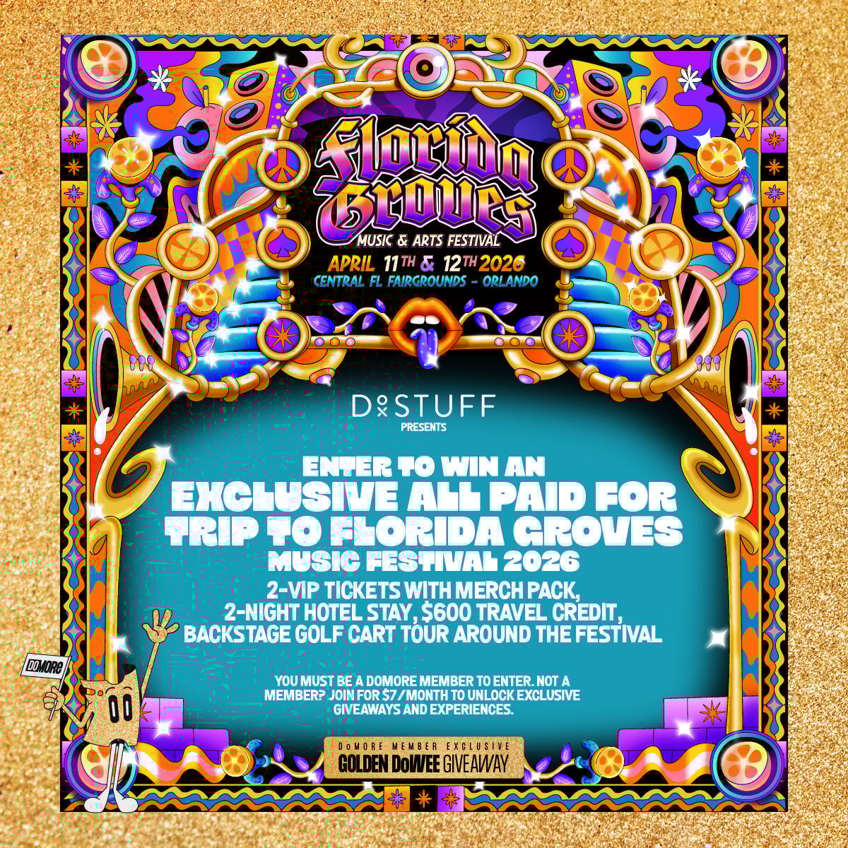Sign up for DoMORE and enter to win a Florida Groves 2026 Flyaway, happening April 11–12 in Orlando. One winner receives two VIP tickets with merch packs, a two-night hotel stay, a $600 travel credit, and a backstage golf cart tour around the festival. Florida Groves brings together music, art, and freedom, with performances from Goose, Daily Bread, Hippie Sabotage, and more. DoMORE members unlock this giveaway plus monthly tickets to events you’ll love every month.